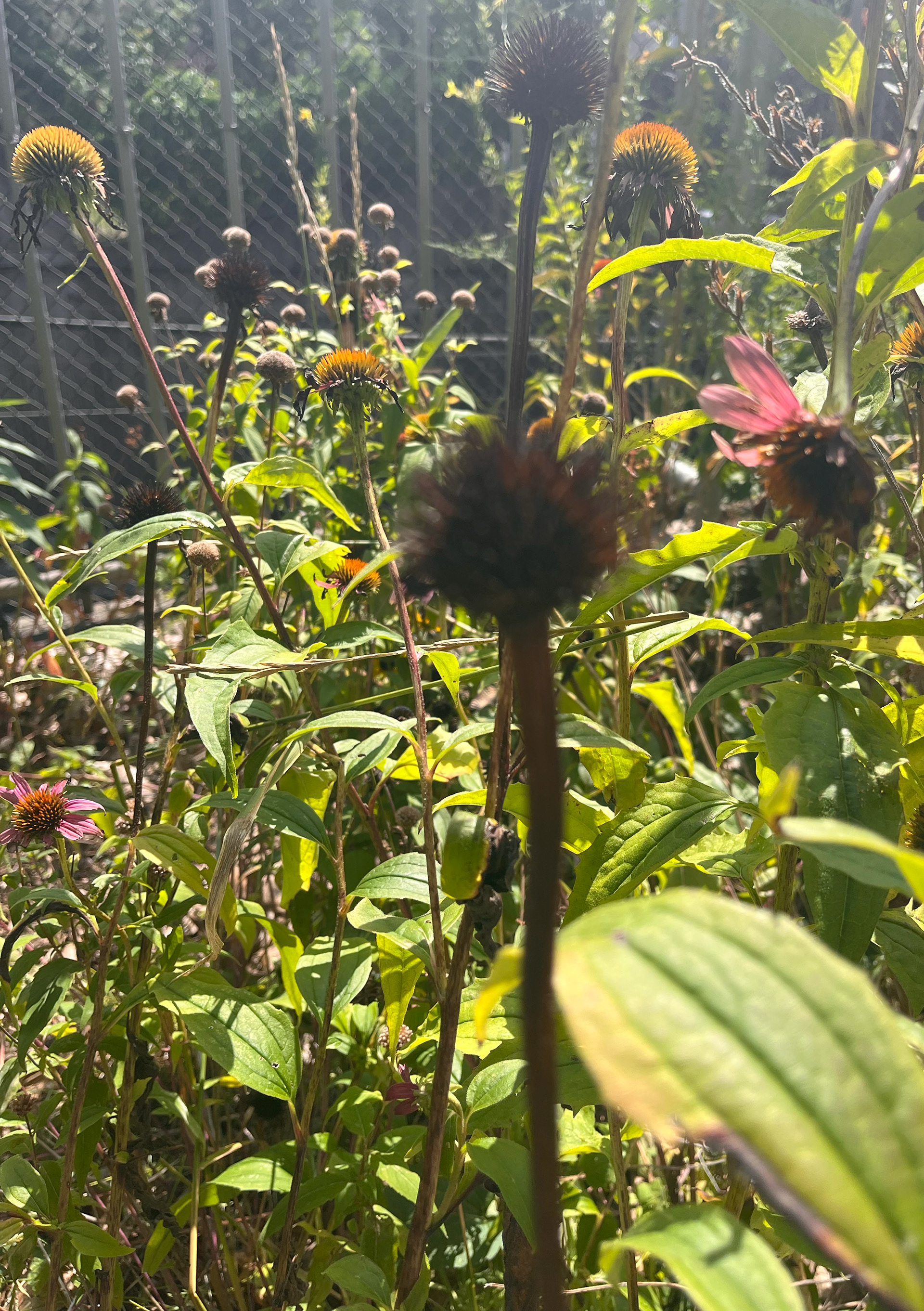 Very late August: foraging for seeds of purple coneflowers, Black-eyed Susans, common milkweed, native sunflowers in Boston's wild streetside landscapes; building seed collections for winter planting